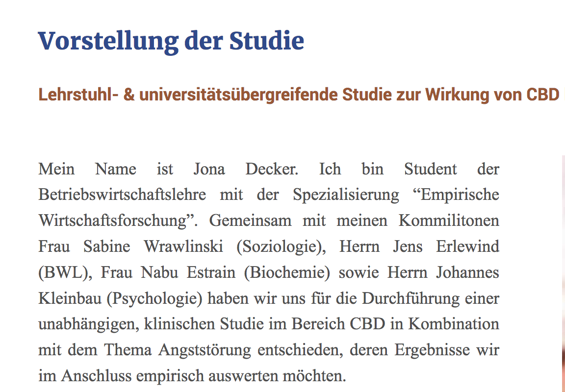 Untersucht hat eine unabhängige Untersuchung des Studenten Jona Decker und seiner Kollegen aus den Bereichen der Betriebswirtschaftslehre, der Biochemie, der Gesellschaftslehre und der Psychologie, wie sich die Nutzung von Cannabidiol auf Patienten, die unter einer Angststörung leiden, auswirkt. Nachzuweisen, ob den betroffenen Patienten durch die regelmäßige Einnahme von Cannabidiol (CBD) geholfen werden konnte, war Ziel. Ein besonderer Fokus liegt in diesem Fall auf der Bekämpfung der sogenannten „sozialen Phobie“. Hier können Sie die gesamte Studie nachlesen.